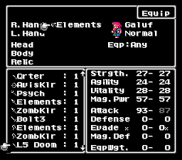 As of v0.81, weapon randomization is a selectable setting. Weapon randomization takes the interesting properties of weapons in FFV and creates a system of randomizing the weapons in such a way that adheres to both the general power structure of the original game's weapons, but drastically changes up the opportunities and potential for weapons to be much more of a forefront in fighting strategy, past weapon strength.